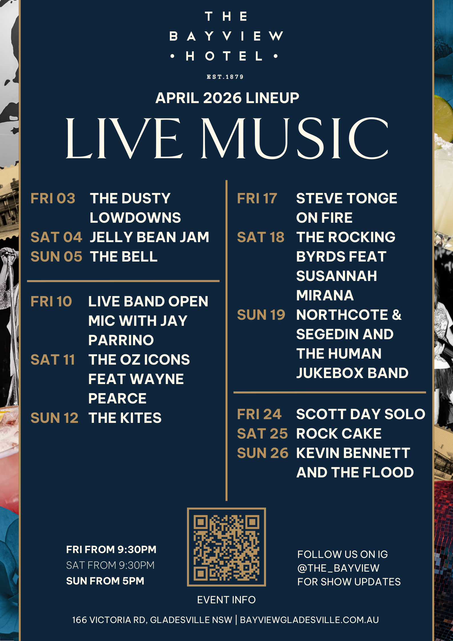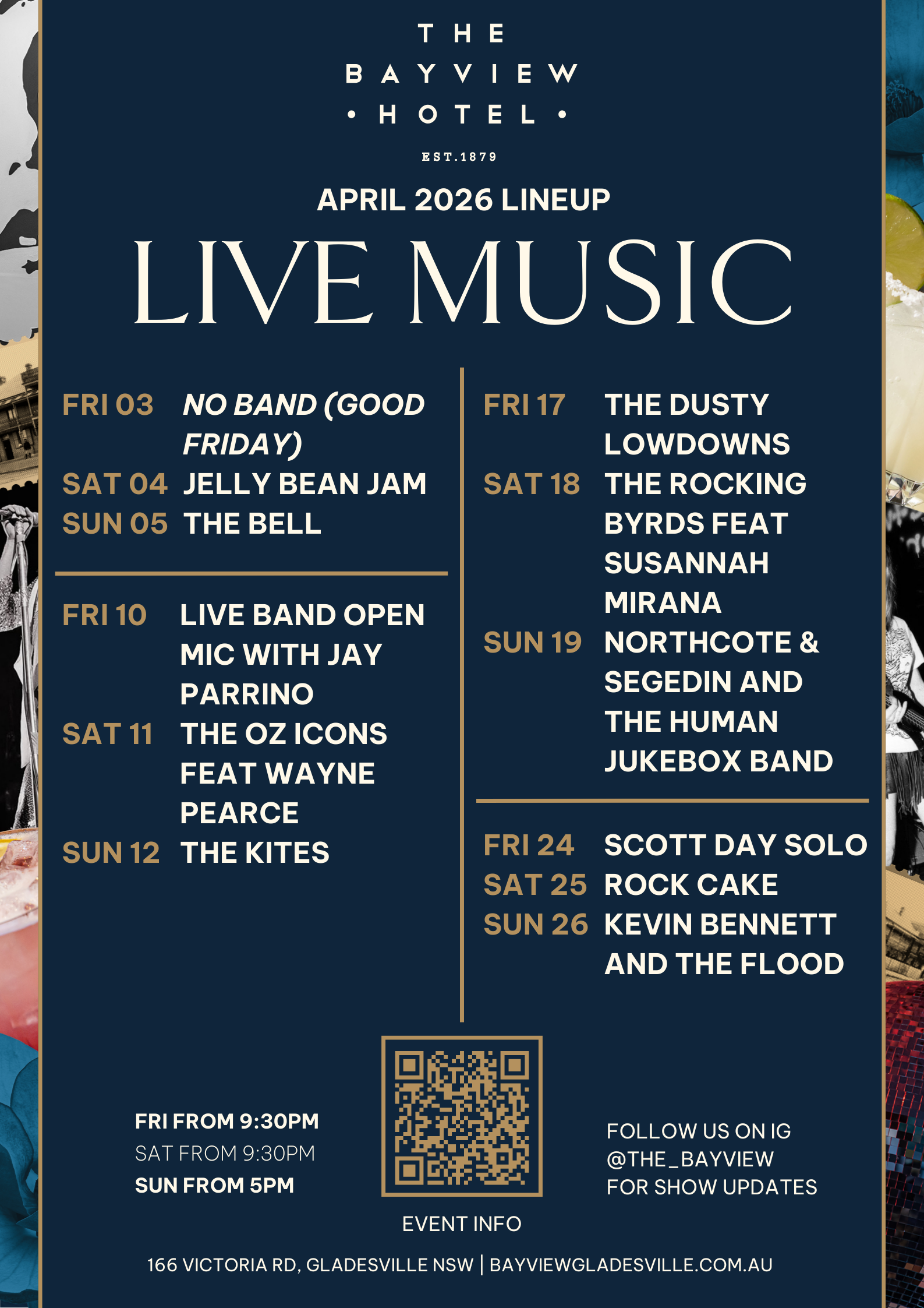 April nights are sounding good at The Bayview Hotel. From laid-back Sunday sessions to full-tilt Friday and Saturday nights, our live music line-up is all about good bands, cold drinks and a buzzing local crowd.