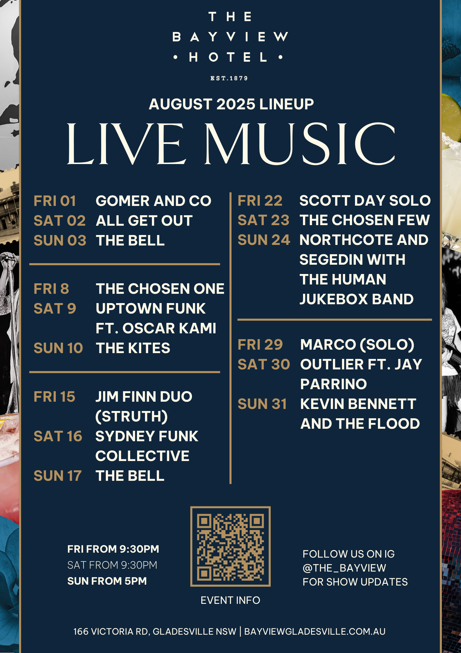 Live music is what we do best at The Bayview — and August’s line-up is looking seriously good. From local legends to rising stars, there’s something for every music lover. Come in, grab a drink, and let the good times roll all weekend long.