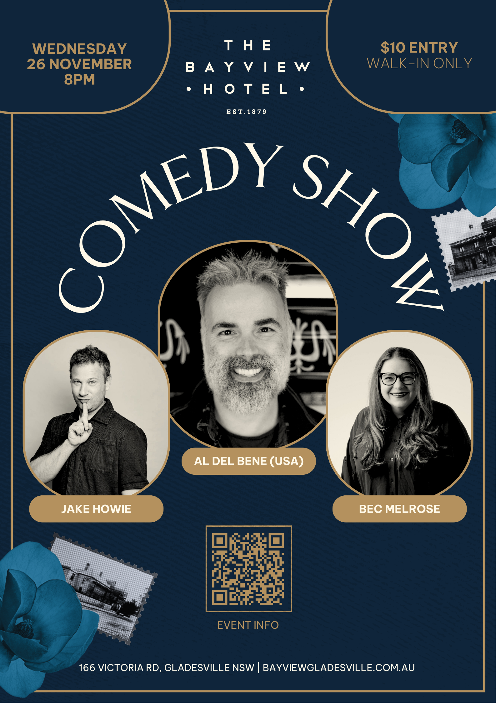 Comedy is back at The Bayview this November— and it’s bringing the big laughs. Join us Wednesday 26 November from 8PM for a night of sharp wit, hilarious acts, and belly laughs.